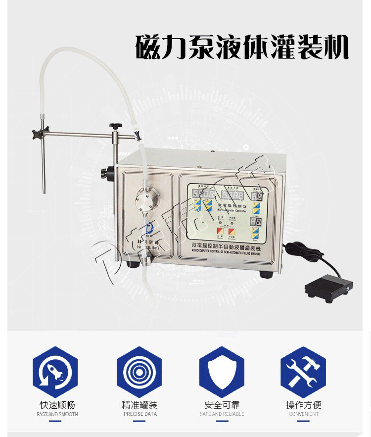 醫(yī)用小型液體灌裝機又叫小型磁力泵灌裝機可灌充絕大類型的液體,包括高粘稠度的液體。醫(yī)用小型液體灌裝機是利用位電腦對微型水泵在灌裝時間、電機轉速等因素上的控制,達到均勻的、重復誤差極小的液體灌裝方式,廣泛的應用于藥物、化工、食品、飲料、油脂、化妝品等行業(yè),適用于低粘度、無顆粒的液體分裝、小批量生產(chǎn)。