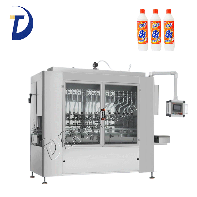說明:該84消毒液灌裝機設備,根據客戶物料,可定制為防腐,防爆機型。與自動理瓶機、自動旋蓋機、標簽貼標或套標機、裝箱打包機組成灌裝流水線。